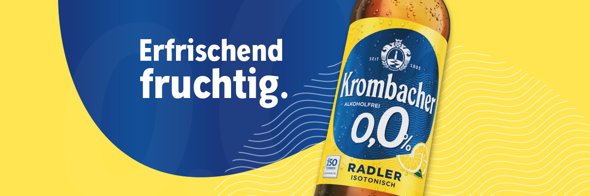 Die spritzige Radler-Erfrischung aus 40% Krombacher Pils und 60% fruchtiger Zitronenlimonade erfrischt natürlich bei o,0% Alkohol. Mit seiner isotonischen Wirkung und der enthaltenen Folsäure ist Krombacher o,0% Radler die perfekte Wahl für alle, die gerne aktiv sind – ob zu Hause oder unterwegs.