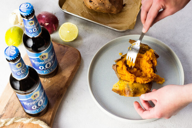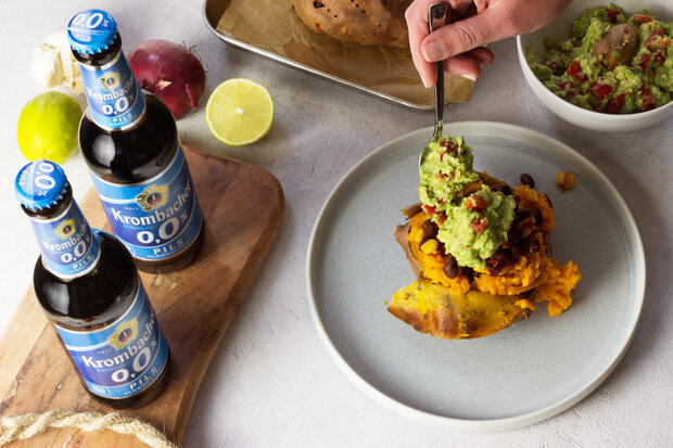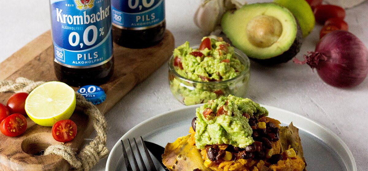 Süßkartoffeln - wer liebt sie nicht? Probiere daher jetzt dieses raffinierte Gericht, welches in nur 60 Minuten zubereitet ist. Die aromatisch süßliche Knolle wird ganz einfach im Ofen gebacken, mit einem pikanten Chili aus Bohnen und Mais gefüllt und mit einer erfrischenden Guacamole getoppt. Im Vergleich zu normalen Kartoffeln enthalten Süßkartoffeln viel Calcium, Eisen, Kalium und weitere wichtige Mikronährstoffe. Also ab in den Ofen damit und mit einem kühlen Krombacher o,0 % Pils genießen!